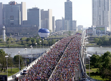 Kurz nach dem Start passieren Tausende Athleten die Reichsbrücke.